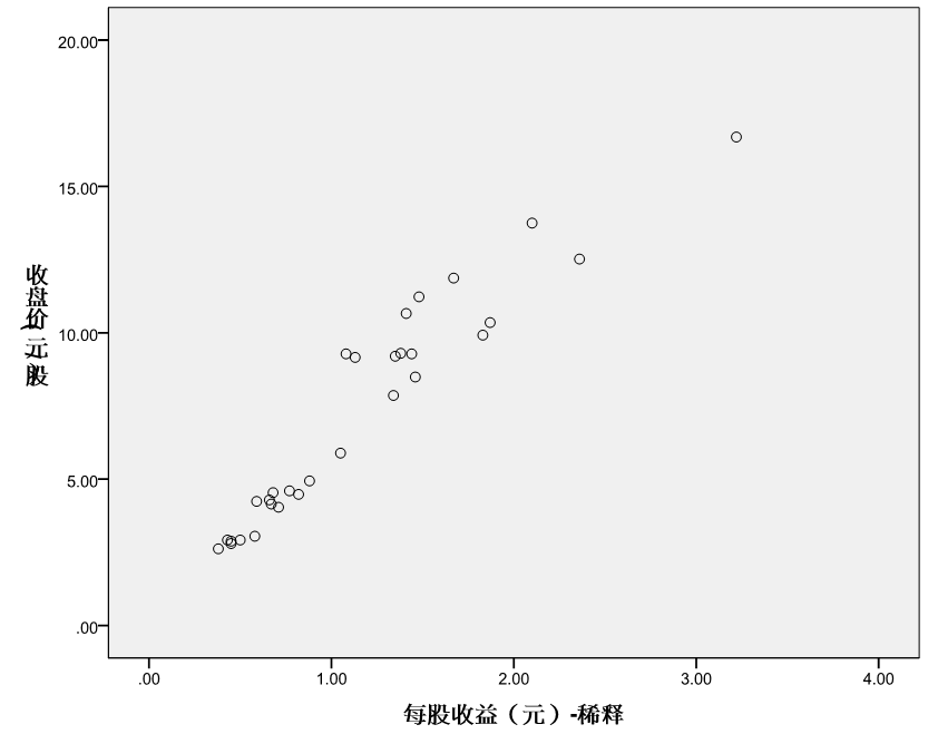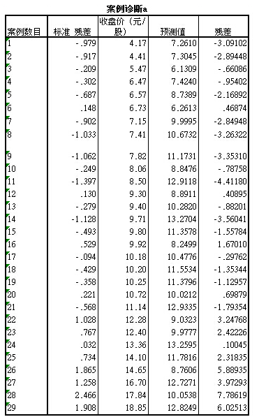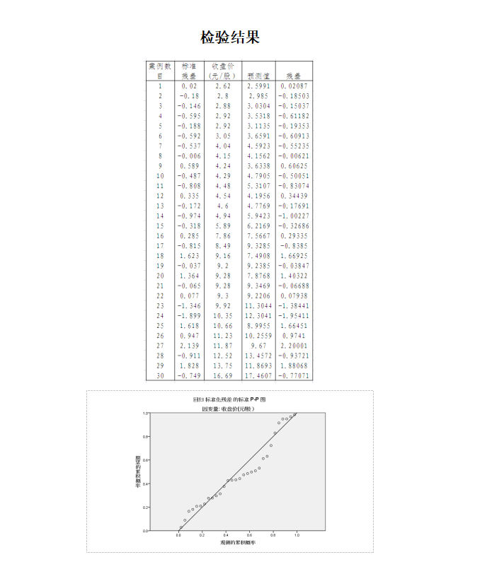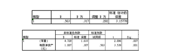 如上图所示,虽然每股净资产离散度较高,但与收盘价分布呈现较强相关性,因此评估选用每股净资产指标进行回归分析,运用SPSS统计分析软件所构建的回归方程及相关检验结果如下: