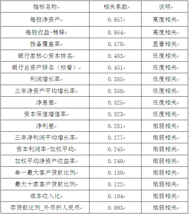 案例2: 商业银行企业价值市场法评估模型的构建(节选) 1.各参数的相关性分析 选用评估基准日沪、深两市若干商业银行作为样本,选择可能与商业银行价值存在影响的25个参数值作为自变量,分析每一个变量与商业银行价值的相关性。 通过量化以上指标与股价的相关程度,筛选得到如下分析结果: