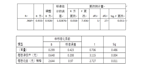 在以上分析的基础上,通过运用SPSS统计分析软件对自变量每股净资产、每股收益进行回归分析,最终获取如下回归方程(此方程已通过多重共线性、F、W检验):