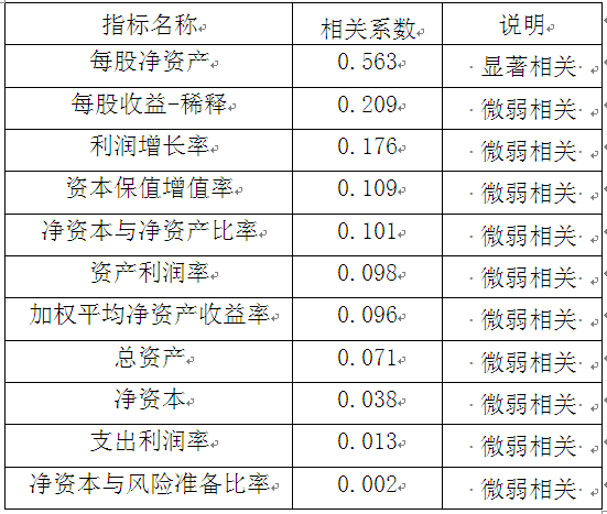 所附案例的结论仅反映撰写时点样本数据的特征,并非最终结论。资产评估师应当在评估实务中,根据实际情况选择样本,选取适用于具体评估业务所需的参数及模型。 案例1: 证券公司企业价值市场法评估模型的构建(节选) 1.各参数的相关性分析 选用评估基准日沪、深两市若干证券公司的样本作为可比对象,选取19个可能与企业价值相关的参数,对可比对象每股单价与这19个参数进行相关性分析,筛选得到如下分析结果: